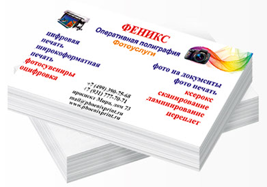 Визитные карточки, изготовленные в «Фото Феникс», говорят сами за себя, оставляют неизгладимое впечатление, с учетом уникальных характеристик и правильного выбора качества бумаги и цифровых параметров печати.