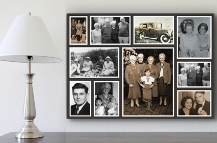 После восстановления, почему бы напечатанную фотографию не поместить в рамку или не напечатать на холсте. Если у вас много фотографий, мы можем создать стильный коллаж, который превратит ваши старые фотографии в современное произведение искусства.
